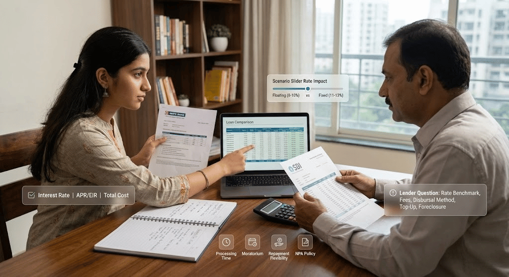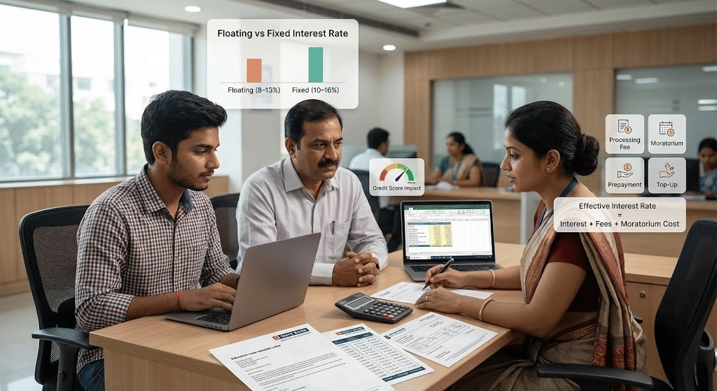 Floating rates: Most education loans use a floating interest rate (linked to external benchmarks such as MCLR, bank base rate, or repo-linked rates). Floating rates are linked to market rates so that EMIs can change over the tenure.