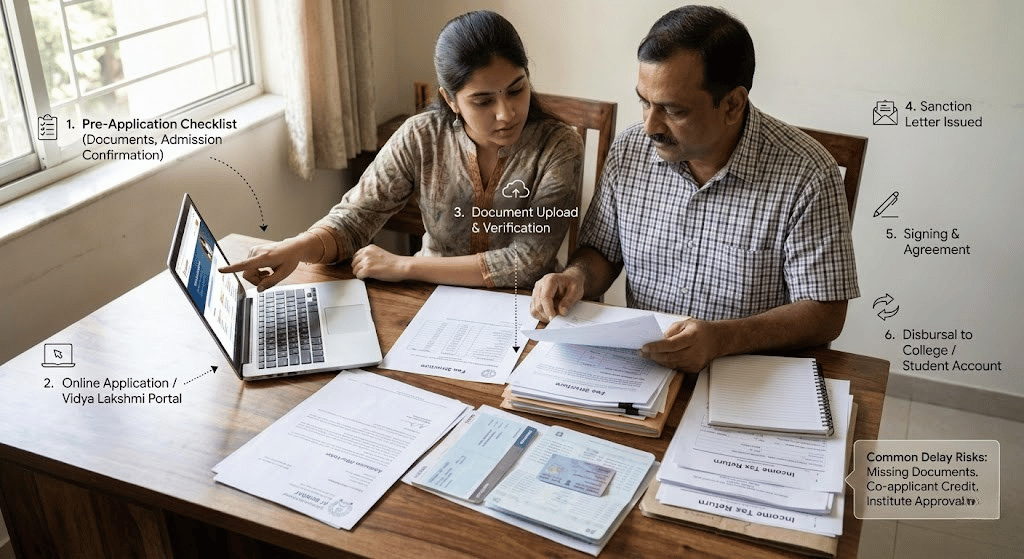 Online pre-application: Enter details on the bank/NBFC website or on Vidya Lakshmi to compare offers.
