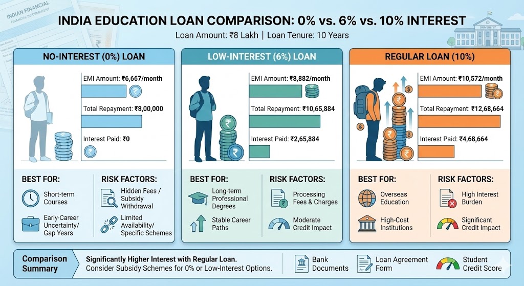 Case in point: A ₹10 lakh loan at 10% vs 0% over 10 years results in a difference of lakhs in total repayment; most students prefer options that provide relief from the monthly burden during the early career years.