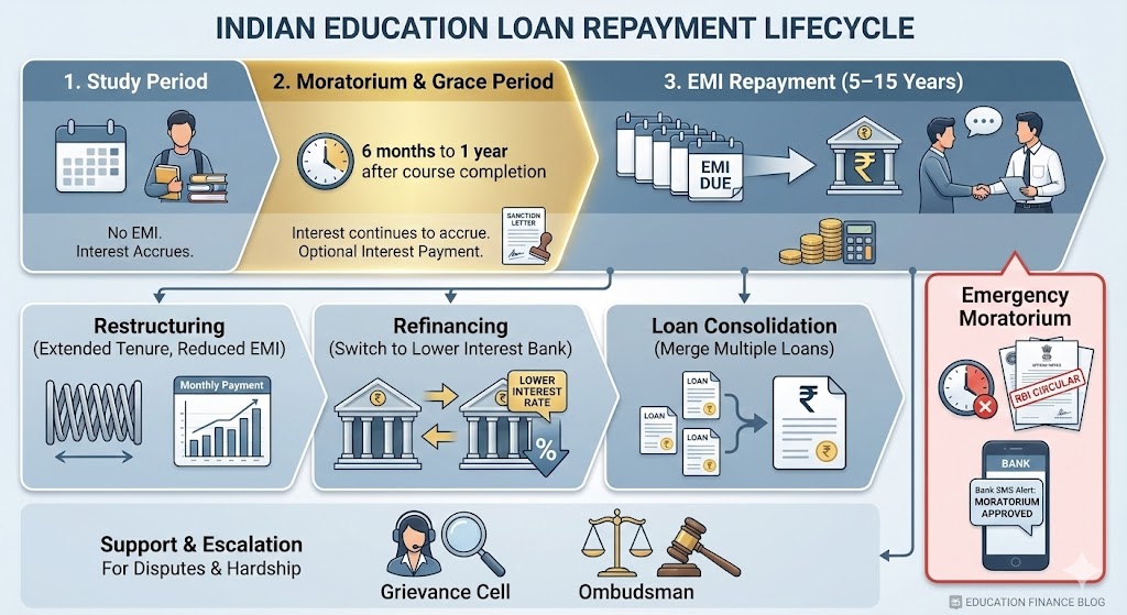 Moratorium: Under the moratorium, you don’t pay EMIs for principal/interest during the study or the immediate post-study period; interest may still accrue if not subsidized.