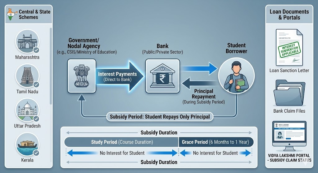 Moratorium: Study plus grace period (6–12 months) is commonly provided; some schemes subsidise interest during moratorium.