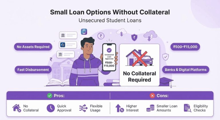 If you are a student seeking quick access to cash without requiring collateral, unsecured loans are a great option. The appeal of unsecured loans is that no assets (such as a house or car) are pledged against the borrowed money, which may be an attractive option for people with assets. Various lenders, including traditional banks, non-banking financial companies (NBFCs), and even digital platforms, offer small student loans without requiring collateral.
