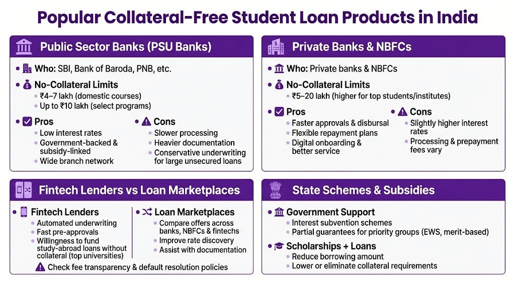 Types of lenders that provide collateral-free student loans (banks, NBFCs, fintechs)